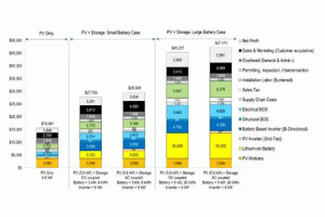 我們發(fā)現(xiàn),使用5.6千瓦太陽能光伏板和3千瓦/6千瓦時(shí)鋰離子電池的小型電池案例的基準(zhǔn)價(jià)格大約是單一的與電網(wǎng)相連的5.6千瓦太陽能光伏系統(tǒng)的2倍(詳情請(qǐng)參考圖1)。對(duì)新裝太陽能光伏+儲(chǔ)能系統(tǒng)而言,直流系統(tǒng)的價(jià)格(27,703美元)比交流系統(tǒng)的價(jià)格(29,568美元)低1,865美元。交流系統(tǒng)的價(jià)格溢價(jià)主要是由于交流配置所需的額外并網(wǎng)換流器造成的硬件和人工成本。然而,在對(duì)比交流與直流系統(tǒng)時(shí),安裝價(jià)格并不是唯一的考慮因素:交流系統(tǒng)在光伏能源即發(fā)即用的應(yīng)用中效率更高,而直流系統(tǒng)則在光伏能源儲(chǔ)存儲(chǔ)的應(yīng)用中更有效率。