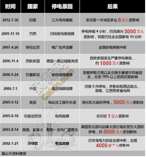 大停電造成的災(zāi)難顯而易見,但全球范圍內(nèi)的大停電事件卻屢見不鮮。2012年7月30、31日印度大停電,6.7億人口在黑暗中度過了兩天,占到了全世界人口的十分之一,起因只是印度北部電網(wǎng)一回400千伏交流輸電線路故障跳閘。