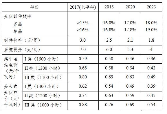 光伏發(fā)電投資、發(fā)電成本和電價(jià)也實(shí)現(xiàn)了大幅度下降,初始投資從2010年的約20元/瓦,降到2015年的8-9元/瓦,再到2017年的6-7元/瓦,光伏發(fā)電標(biāo)桿電價(jià)從2011年的1.15元/千瓦時(shí),降到2014年的0.9-1.0元/千瓦時(shí),再到2017年0.65-0.85元/千瓦時(shí)。2016年光伏領(lǐng)跑技術(shù)基地最低中標(biāo)電價(jià)達(dá)到0.45元/千瓦時(shí),中標(biāo)電價(jià)水平普遍低于當(dāng)年光伏標(biāo)桿電價(jià)15-35%。