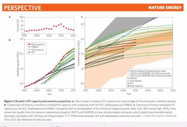 從上圖可見(jiàn),國(guó)際能源署(IEA)(黑色曲線)、德國(guó)全球變化委員會(huì)(WBGU)(藍(lán)色曲線)、綠色和平(Green Peace)(綠色曲線)對(duì)于1995-2015年光伏發(fā)展的預(yù)測(cè)與光伏的實(shí)際發(fā)展軌跡相去甚遠(yuǎn),只有綠色和平近幾年的預(yù)測(cè)比較接近現(xiàn)實(shí)。那么為什么這些相當(dāng)嚴(yán)謹(jǐn)而又權(quán)威的機(jī)構(gòu)對(duì)于光伏發(fā)展的模型分析預(yù)測(cè)如此不靠譜呢?墨卡托研究所的文章認(rèn)為主要是以下三個(gè)原因: