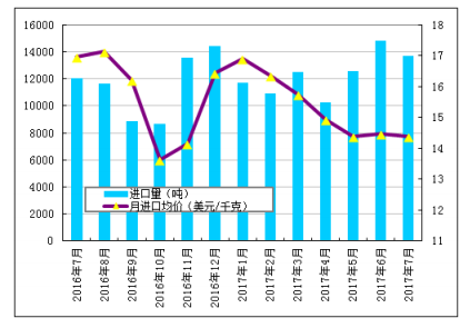 圖3 2016年7月-2017年7月多晶硅進(jìn)口量及進(jìn)口均價(jià)示意圖