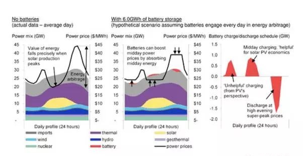 我們通常認(rèn)為,電池與可再生能源之間存在高度共生關(guān)系,即電池將在有可再生能源電力產(chǎn)出的時(shí)段充電,并在其他時(shí)段放電。從多個(gè)層面來說,這種設(shè)計(jì)都非常合理。本質(zhì)而言,電池可通過將低價(jià)值時(shí)段的可再生能源電力產(chǎn)出轉(zhuǎn)移至高價(jià)值時(shí)段,實(shí)現(xiàn)“能源套利”,從而降低電網(wǎng)的短期成本,并為可再生能源項(xiàng)目帶來收益。