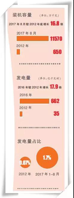 國家能源局數(shù)據(jù)顯示,近4年來,我國光伏年均增長率均超過60%,其中2015年新增規(guī)模超過1500萬千瓦,累計裝機容量達到4300萬千瓦,超越德國成為全球規(guī)模最大的光伏市場。來自中電聯(lián)的統(tǒng)計數(shù)據(jù),2016年我國新增光伏裝機容量更是達到歷史性的3459萬千瓦,首次超過風電,約占當年全球新增光伏裝機容量的一半,累計裝機達到77GW,幾乎達到同期德國40GW的兩倍。至2017年7月,我國光伏裝機突破1億千瓦;8月,超過1.1億千瓦,提前完成了“十三五”規(guī)劃目標。