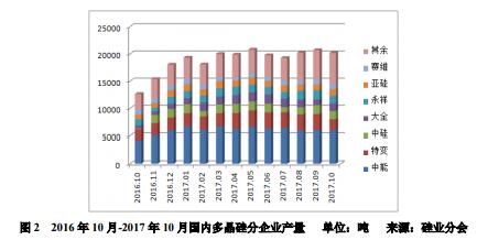 2017年9-10月份國(guó)內(nèi)多晶硅產(chǎn)量共計(jì)4.09萬噸,同比增加57.9%,其中9月份產(chǎn)量2.07萬噸,10月份2.02萬噸,同比增幅分別為58.0%和57.8%。9-10月份產(chǎn)量同比大幅增加的主要原因是,去年同期國(guó)內(nèi)江蘇中能、新特能源、洛陽(yáng)中硅、新疆大全、亞洲硅業(yè)等一線大廠集中檢修,產(chǎn)出環(huán)比減少25.1%,故2017年9-10月份國(guó)內(nèi)多晶硅產(chǎn)量同比增幅較大。10月份產(chǎn)量環(huán)比小幅減少2.4%,雖然10月份新特、大全、神舟、國(guó)電四家企業(yè)檢修,影響部分供應(yīng),但到月底其中三家已恢復(fù)正常生產(chǎn),加之前期檢修結(jié)束后復(fù)產(chǎn)的企業(yè)產(chǎn)出量有一定程度增加,彌補(bǔ)一部分供應(yīng),故10月份國(guó)內(nèi)多晶硅產(chǎn)量較9月份減幅不大。9-10月份按產(chǎn)量排序,江蘇中能、新特能源、洛陽(yáng)中硅分別位居前三位,這三大企業(yè)產(chǎn)量占總產(chǎn)量的49.0%。前七家萬噸級(jí)企業(yè):中能、特變、中硅、永祥、大全、亞硅、賽維產(chǎn)量共計(jì)2.98萬噸,占國(guó)內(nèi)總產(chǎn)量的72.8%。