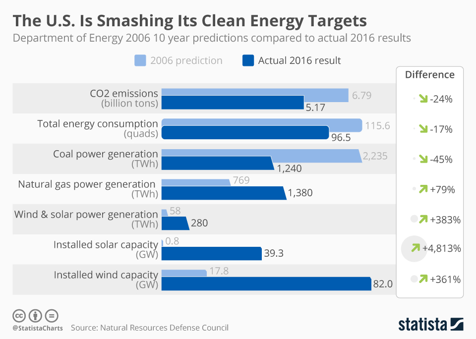 美國數據供應商Statista稱,2016年,二氧化碳實際排放,比十年前的預期少了24%。煤炭發(fā)電量比預期的要低45%,而天然氣發(fā)電比預期的高出79%。