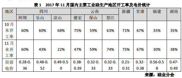 2017年11月我國開工率小幅下調(diào)。根據(jù)硅業(yè)分會(huì)統(tǒng)計(jì),截至11月底新疆、云南、四川三大主產(chǎn)區(qū)開工率如下:新疆開工率維持在75%;云南怒江、德宏、保山開工率分別為74%、47%、59%;四川阿壩、樂山、涼山開工率分別為60%、43%、22%。云南德宏以及四川涼山、樂山地區(qū)開工率較10月末出現(xiàn)不同程度回落,云南德宏開爐數(shù)已從11月初的41臺(tái)爐下降至月底的28臺(tái)爐;11月25日四川涼山、樂山地區(qū)正式進(jìn)入枯水季節(jié),電價(jià)上調(diào)后大部分工廠進(jìn)入停爐檢修期。11月底四川涼山、樂山枯水期電價(jià)上調(diào)至0.49-0.52元/度;云南地區(qū)枯水期電價(jià)預(yù)計(jì)將于12月出臺(tái),屆時(shí)怒江、德宏、保山開工率將進(jìn)一步走低。