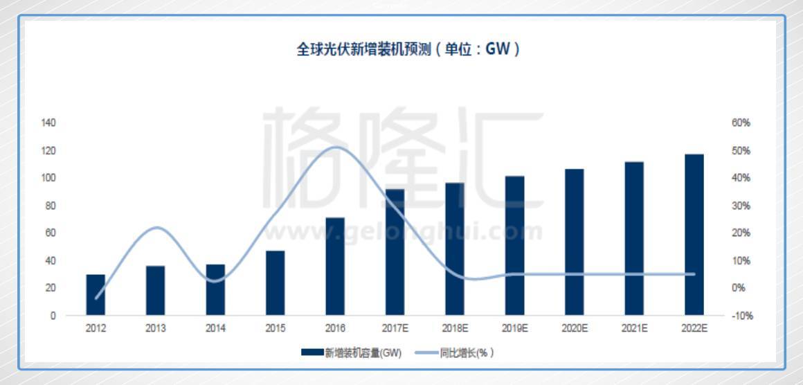 由于光伏過去遠超計劃的裝機量,2018年到2022年全球光伏市場需求同比增長將實現(xiàn)階段性平穩(wěn),預(yù)計2017年全球光伏新增裝機92GW,同比增長29.22%。2018年新增裝機穩(wěn)定增長,年均增長率將回落到5%~6%。
