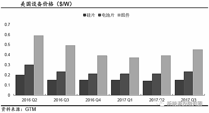 2017 年美國整體光伏裝機(jī)表現(xiàn)良好:17 年第一季度的安裝量為2044MWdc,比去年同期略有下滑,但考慮到16 年情況特殊,一季度整體可以。第二季度安裝量為2387MWdc,比去年同比增加8%,創(chuàng)史上二季度安裝量新高。三季度則為2031MWdc,低于去年,主要受政治不確定、設(shè)備價(jià)格上漲影響。總體來看,2017 美國光伏裝機(jī)量保持穩(wěn)定,預(yù)計(jì)2017 年全年安裝量會超過8GWdc。