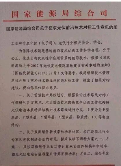 近日,一份《國(guó)家能源局綜合司征求光伏前沿對(duì)標(biāo)工作的意見函》(下稱“征求意見稿”)正式下發(fā),能源局要求參與征詢意見的相關(guān)行業(yè)組織和光伏企業(yè)的建議務(wù)必在11日(今天)提交完畢。