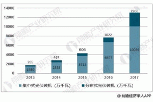 據(jù)前瞻產(chǎn)業(yè)研究院發(fā)布的《光伏發(fā)電產(chǎn)業(yè)市場前瞻與投資戰(zhàn)略規(guī)劃分析報(bào)告》數(shù)據(jù)顯示,2017年,中國光伏發(fā)電累計(jì)裝機(jī)容量1.3億千瓦,占全部發(fā)電設(shè)備容量的比例為7.3%,同比提升2個(gè)百分點(diǎn)。光伏發(fā)電量在全部發(fā)電量中的比重,從2016年的1.1%提升到2017年的1.8%。光伏發(fā)電裝機(jī)結(jié)構(gòu)進(jìn)一步優(yōu)化,分布式光伏在光伏裝機(jī)中的比重達(dá)到23%,同比增加10個(gè)百分點(diǎn)。