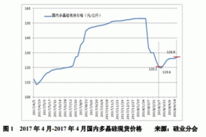 2018年3-4月份多晶硅價格緩慢回升,3月初太陽能一級致密料成交價觸底12.02萬元/噸,第二周反彈回升至4月底的12.69萬元/噸,增幅為5.6%。4月份均價12.63萬元/噸,環(huán)比增長3.8%。
