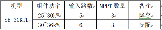 SE 30KTL最大接入組件功率為36kW,有3路MPPT,每路MPPT對應(yīng)2路組串輸入,則每路組串輸入的最大功率為6kW,所以只要以5~6kW(按100%~120%超配范圍考量)整數(shù)倍的關(guān)系做降額設(shè)計,就不會縮短組串長度,并可實現(xiàn)降額使用!