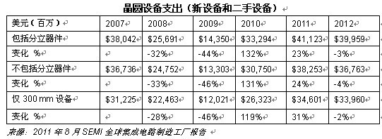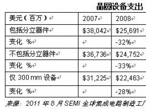 SEMI全球集成電路制造工廠報告表明,2011年資本支出將增至411億美元,達(dá)到歷史最高水平。由于某些公司基于更廣泛的經(jīng)濟(jì)狀況調(diào)整了計劃,這一新出爐的預(yù)測將增長百分比下調(diào)至23% (2011年5月預(yù)期增長為31%)。盡管2012年的支出有下降趨勢,但總體上仍有可能達(dá)到第二個歷史最高點。