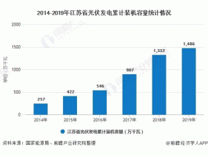 據(jù)國(guó)家能源局統(tǒng)計(jì)數(shù)據(jù)顯示,2014年,江蘇省累計(jì)裝機(jī)容量?jī)H257萬千瓦,到2018年,全省光伏發(fā)電累計(jì)裝機(jī)容量突破1000萬千瓦,達(dá)到1332萬千瓦,同比增長(zhǎng)46.9%。受光伏補(bǔ)貼退坡等政策影響,從目前裝機(jī)容量來看,2019年增速較前幾年有所下降。