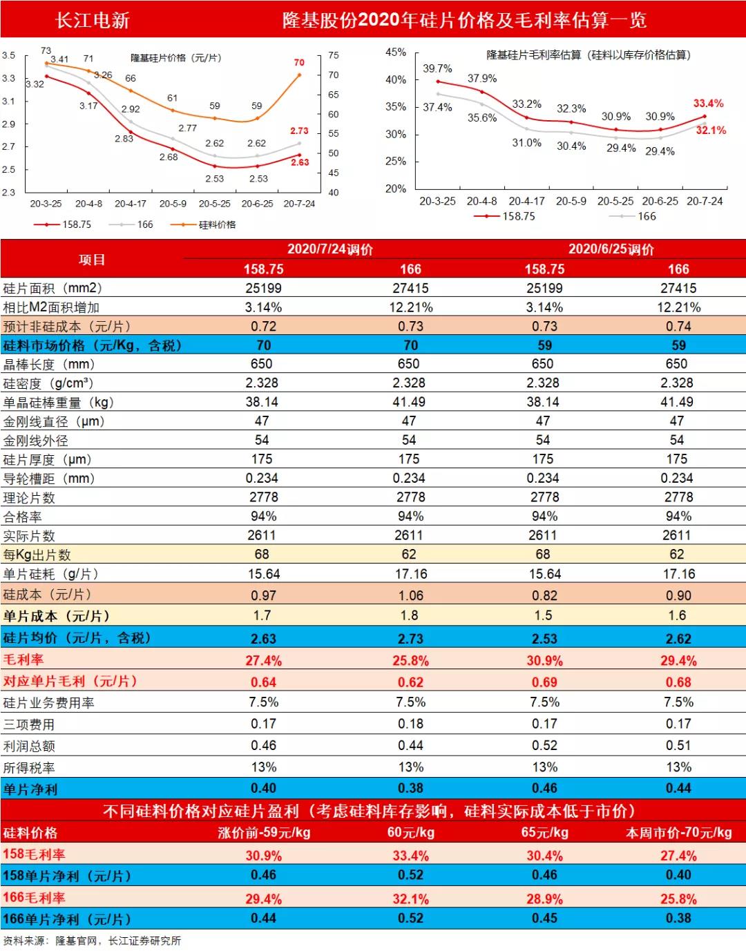 硅片漲價,龍頭盈利強勁:隆基昨日公布8月產(chǎn)品定價,隆基G1、M6硅片價格分別上漲0.10元/片、0.11元/片至2.63、2.73元/片,考慮到7月份還有大客戶優(yōu)惠,8月相較于7月實際上漲接近0.2元/片。當(dāng)前價格水平下,以硅料庫存成本60元/kg計算,公司硅片毛利率在33%左右,對應(yīng)單片凈利在0.55元/片左右;以硅料市價70元/kg計算,公司硅片毛利率在27%左右,對應(yīng)單片凈利在0.42元/片。