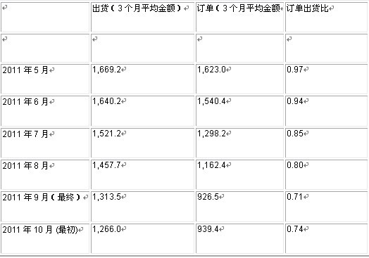 2011年10月3個(gè)月平均出貨金額為12.7億美元,較9月上修值(13.1億美元)短少3.6%,較2010年同期的16.2億美元縮減22.0%。
