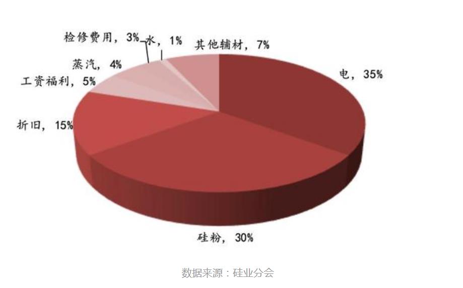 在當(dāng)前主流多晶硅生產(chǎn)法-改良西門子法的生產(chǎn)成本中,電力成本、原料成本和折舊成本是主要部分,三者合計(jì)占到總成本的80%左右,其中電力成本占比最大,占比35%;硅粉成本占比30%;折舊成本占比達(dá)15%。因而,電力、原材料、折舊成為降低多晶硅生產(chǎn)成本的主要領(lǐng)域。