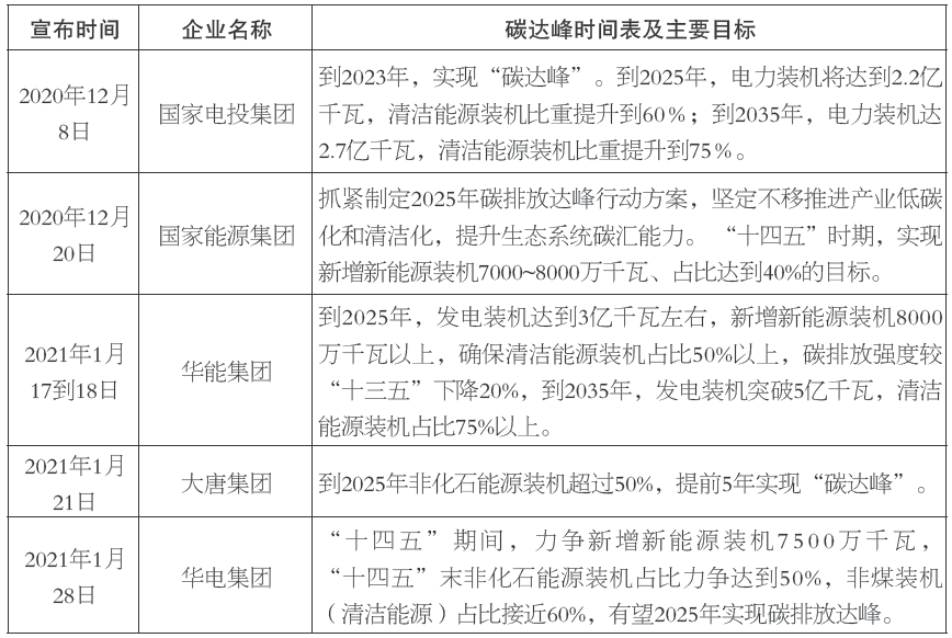 表1 五大發(fā)電企業(yè)碳達(dá)峰時(shí)間表及主要目標(biāo)