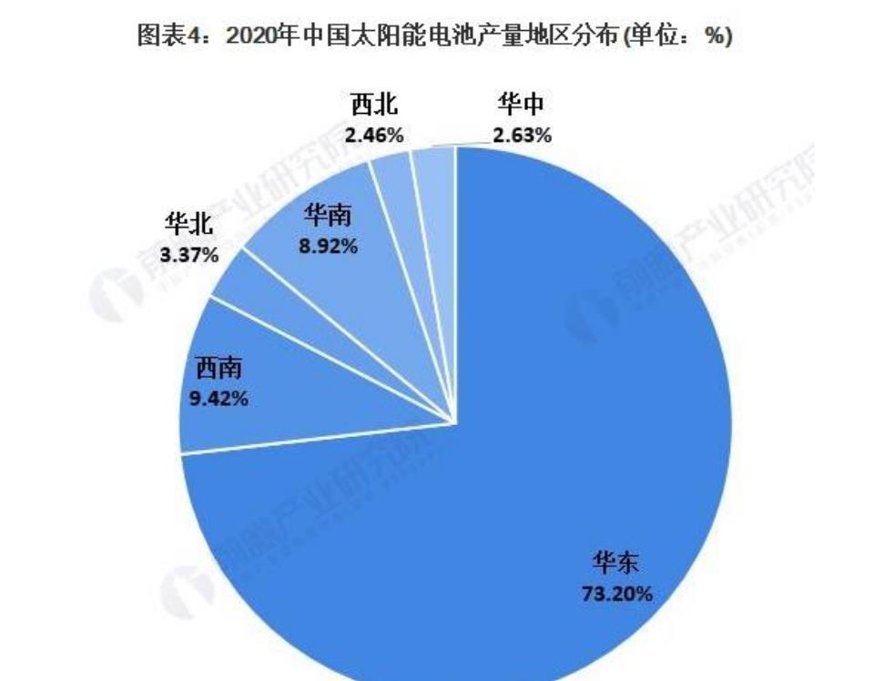 2020年,在我國太陽能電池的生產(chǎn)地區(qū)中,華東地區(qū)電池產(chǎn)量最多,占全國產(chǎn)量的73.2%;西南地區(qū)產(chǎn)量排在第二位,電池產(chǎn)量占比為7.42%。