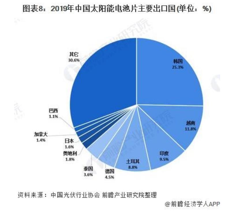 從出口國分布來看,2019年我國電池片出口國出口額排名第一的是韓國,占比為25.3%;越南排名第二,占比為11.8%;印度排名第三,占比為9.5%。2019年前十大出口國合計占比69.4%,比2018年同期的51.2%大幅提高18.2個百分點,海外產(chǎn)能進一步集中。