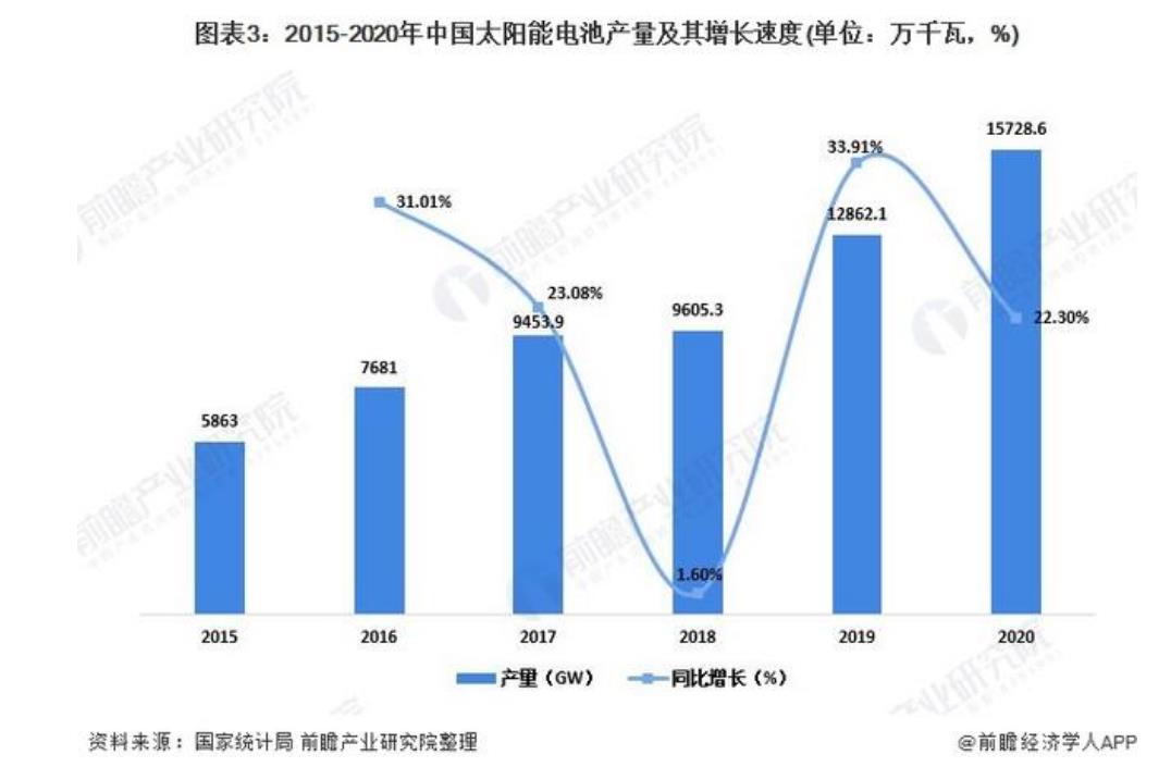 2020年,太陽能發(fā)電新增裝機數(shù)據(jù)為48.2GW,繼續(xù)保持全球第一,創(chuàng)歷史第二新高,同比增長60%。2015年以來,我國太陽能電池產(chǎn)量規(guī)模穩(wěn)步提升。據(jù)國家統(tǒng)計局統(tǒng)計數(shù)據(jù)顯示,2020年我國太陽能電池產(chǎn)量為15728.6萬千瓦,同比增長22.3%。