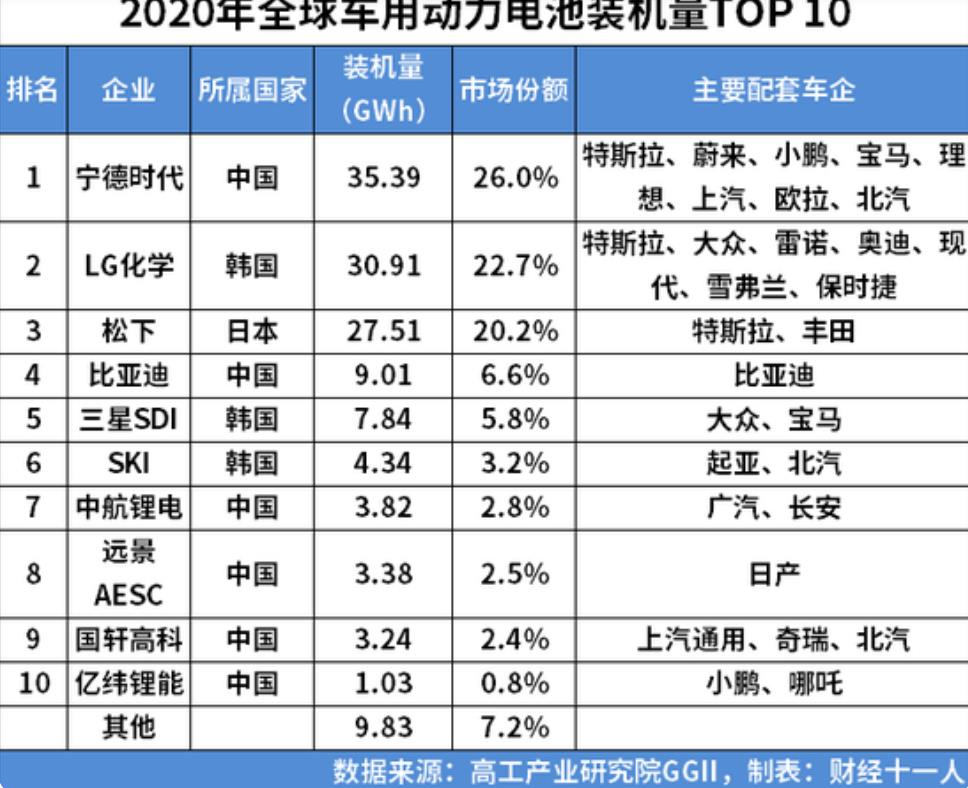 表1 :2020年全球車用動(dòng)力電池裝機(jī)量TOP10