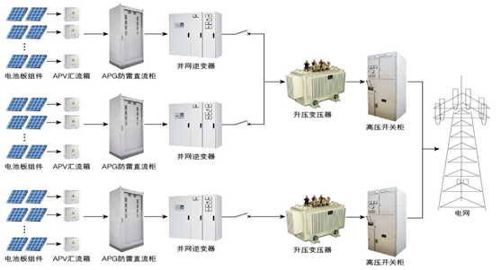 當光線照射太陽電池表面時,一部分光子被硅材料吸收;光子的能量傳遞給了硅原子,使電子發(fā)生了越遷,成為自由電子在P-N結(jié)兩側(cè)集聚形成了電位差,當外部接通電路時,在該電壓的作用下,將會有電流流過外部電路產(chǎn)生一定的輸出功率。利用電池組件中半島體材料的光電效應(yīng),使太陽能轉(zhuǎn)換為直流電,以一定數(shù)量的電池組件串聯(lián)達到需要的電壓后經(jīng)直流匯流箱匯入逆變器室直流配電柜,接入逆變器轉(zhuǎn)換為270V交流電,再經(jīng)箱式變壓器將電壓升高至35kV,通過架空或地埋的35kV線路進入升壓站35kV配電室,經(jīng)主變壓器升壓至電網(wǎng)規(guī)定的電壓等級(常見為35kV、110kV、330kV)并入電網(wǎng)(如圖1所示)。