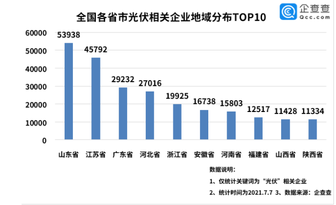 企查查數(shù)據(jù)顯示,我國目前現(xiàn)存光伏相關(guān)企業(yè)34.82萬家。近十年相關(guān)企業(yè)年注冊量變化趨勢起伏較大,2017年注冊量達(dá)到7.4萬家,為近十年來最高,近三年增速有所下滑。2021上半年新增光伏企業(yè)4.22萬家,同比增長75%。從地域分布來看,山東、江蘇、廣東的光伏相關(guān)企業(yè)分列前三。