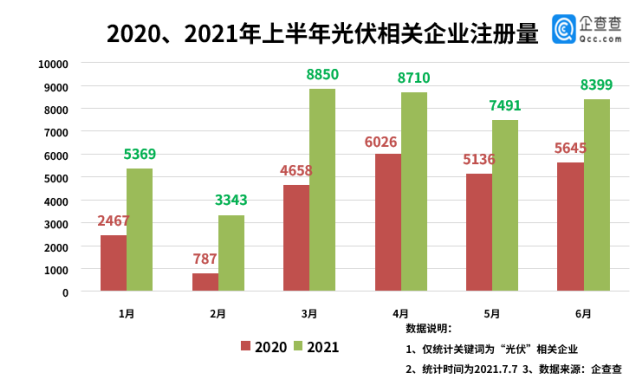 企查查數(shù)據(jù)顯示,截至7月7日,今年我國共新增注冊光伏相關(guān)企業(yè)4.33萬家。與2020年上半年相比,今年上半年注冊總量同比上漲75%,1-6月的注冊量均領(lǐng)先去年。