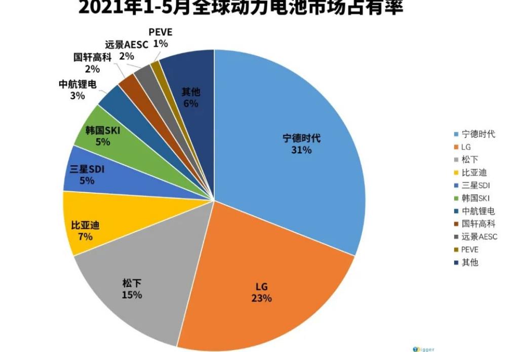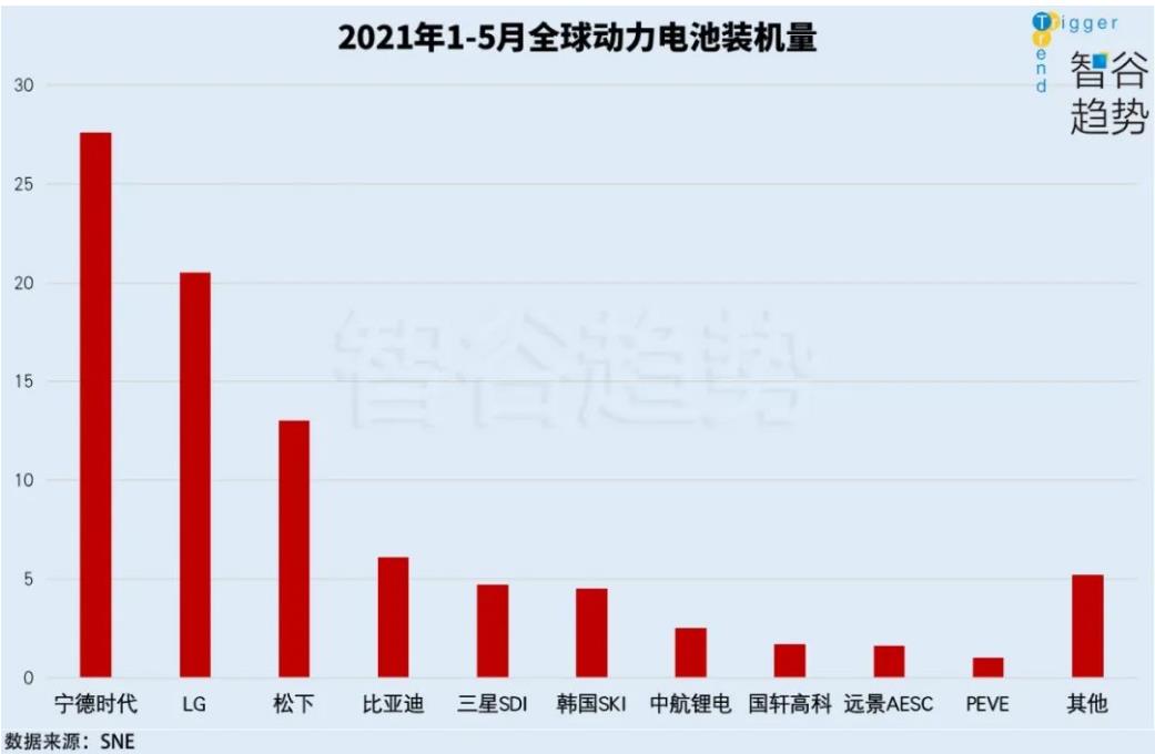 2021年1-5月,動(dòng)力電池的裝車量達(dá)到88.4GWh(百萬千瓦時(shí)),同比上升了223.9%。行業(yè)前10的龍頭中,中國占到5家,韓國3家,日本2家。