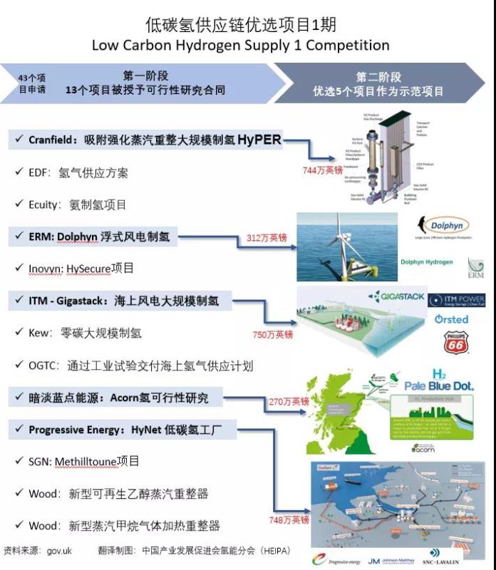 2020年4月,英國(guó)商業(yè)、能源和產(chǎn)業(yè)戰(zhàn)略部(BEIS)發(fā)布了低碳?xì)涔⿷?yīng)優(yōu)選項(xiàng)目(Hydrogen Supply Competition),資助3300萬英鎊,重點(diǎn)支持低碳?xì)涔⿷?yīng)解決方案的可行性研究以及典型示范項(xiàng)目的開發(fā)。