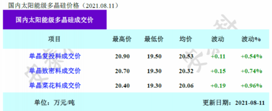 8月11日,硅業(yè)分會(huì)公布最新硅料價(jià)格數(shù)據(jù)。其中單晶復(fù)投料價(jià)格區(qū)間在19.5-20.9萬元/噸,成交均價(jià)小幅回升至20.53萬元/噸,周環(huán)比漲幅為0.54%;單晶致密料價(jià)格區(qū)間在19.3 -20.7萬元/噸,成交均價(jià)回升至20.32萬元/噸,周環(huán)比漲幅為0.74%。
