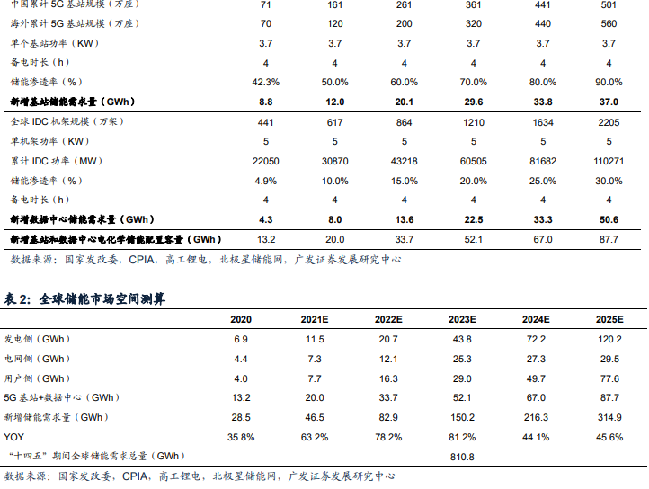 5G基站與數(shù)據(jù)中心的高耗能屬性迫使運(yùn)營商通過配備儲能進(jìn)行綜合能源管理來降低整體用電成本,同時鋰電池替代UPS鉛酸電池需求明顯,疊加政策端探索數(shù)據(jù)中心儲能參與電網(wǎng)互動來提高資源使用效率,預(yù)計配儲滲透率將實(shí)現(xiàn)快速提升,儲能時長同樣以4小時為主。