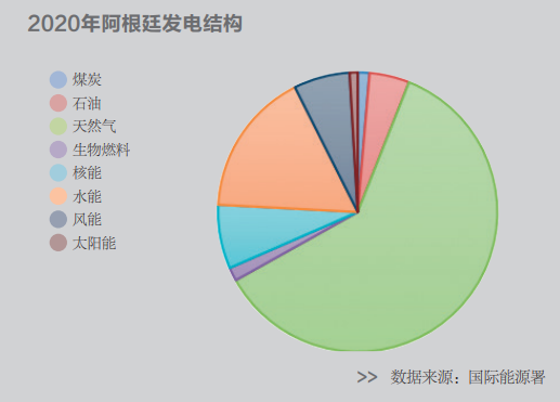 阿根廷電力生產(chǎn)主要以天然氣發(fā)電為主,水能、核能和風(fēng)能次之。截至2020年年底,天然氣發(fā)電量占比達(dá)到60.89%,水能發(fā)電量次之,占比為16.74%;核能發(fā)電量第三,占比為7.39%,風(fēng)能發(fā)電量的占比為6.49%;茉矗66.89%)仍然“主宰”阿根廷電力生產(chǎn);可再生能份額持續(xù)提升,占比(25.73%)超過四分之一。由于天然氣供應(yīng)的不確定性,目前阿根廷的燃?xì)獍l(fā)電面臨供應(yīng)缺口。