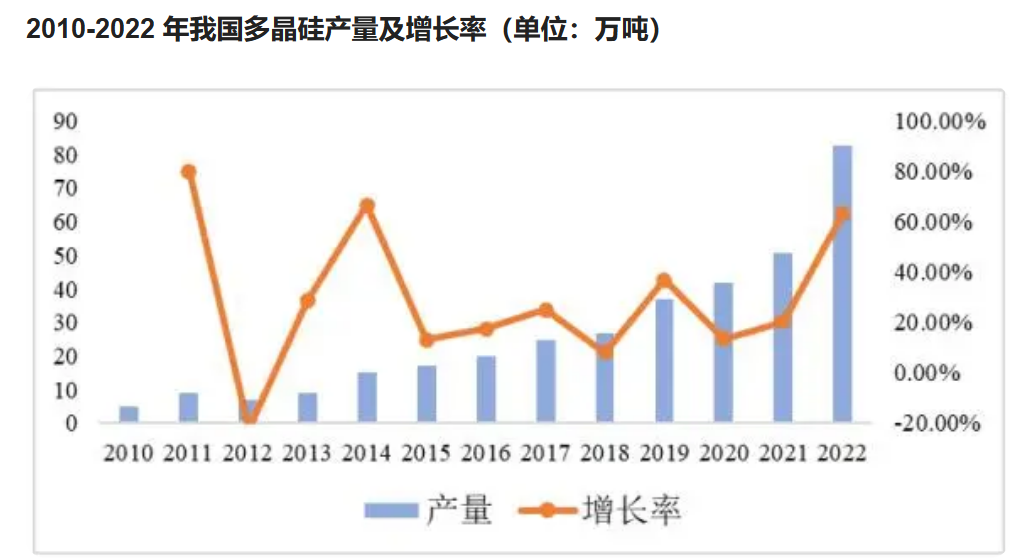 2021年多晶硅產(chǎn)能增加主要來(lái)自于通威、保利協(xié)鑫等新建產(chǎn)線投產(chǎn),以及中硅高科、聚光硅業(yè)等復(fù)產(chǎn),在產(chǎn)企業(yè)設(shè)法提高產(chǎn)能利用率,部分企業(yè)產(chǎn)量甚至超過(guò)名義產(chǎn)能,產(chǎn)業(yè)集中度進(jìn)一步提升。根據(jù)中國(guó)光伏行業(yè)協(xié)會(huì)數(shù)據(jù),2022年我國(guó)多晶硅產(chǎn)量82.7萬(wàn)噸,同比增長(zhǎng)63.4%。