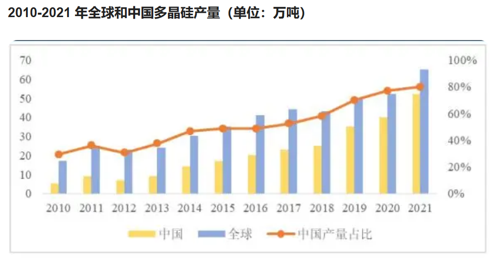 2021年全球多晶硅有效產(chǎn)能為77.4萬(wàn)噸,同比增加27.3%;全球多晶硅產(chǎn)量64.2萬(wàn)噸,同比增加23.2%。2021年,我國(guó)多晶硅產(chǎn)能達(dá)到62.3萬(wàn)噸,同比增加36.3%,產(chǎn)量約50.6萬(wàn) 噸,同比增加 27.8%,產(chǎn)能、產(chǎn)量均排名世界第一。